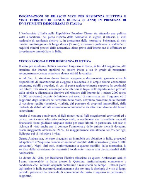 850/2001 per lo straniero che disponga di risorse economiche sufficienti per mantenersi autonomamente senza dover svolgere attività di lavoro. Il visto per residenza elettiva consente l'ingresso in italia allo straniero che intenda stabilirsi nel nostro paese e che dimostri di possedere risorse sufficienti a mantenersi autonomamente senza esercitare alcuna.